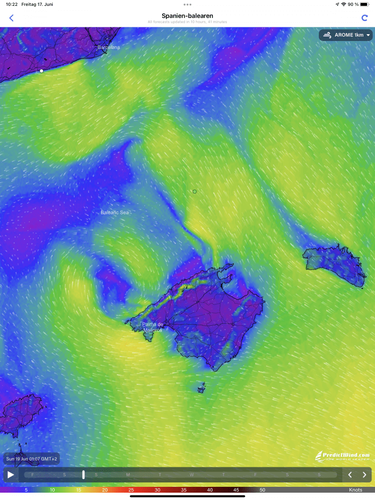 Ich beobachte im Prinzip seit dem Einlaufen auch aus der Entfernung neugierig das Wetter für die Weiterreise, um ein Gefühl dafür zu bekommen, wie das Segelwetter hier im Mittelmeer so ist. Es gab nur wenige Momente, in denen ich dachte, dass das jetzt ein passendes Wetterfenster für das Weiterkommen sein könnte. Pünktlich zur geplanten Abfahrt nach Mallorca gibt es dann tatsächlich eine gute und eine schlechte Nachricht.