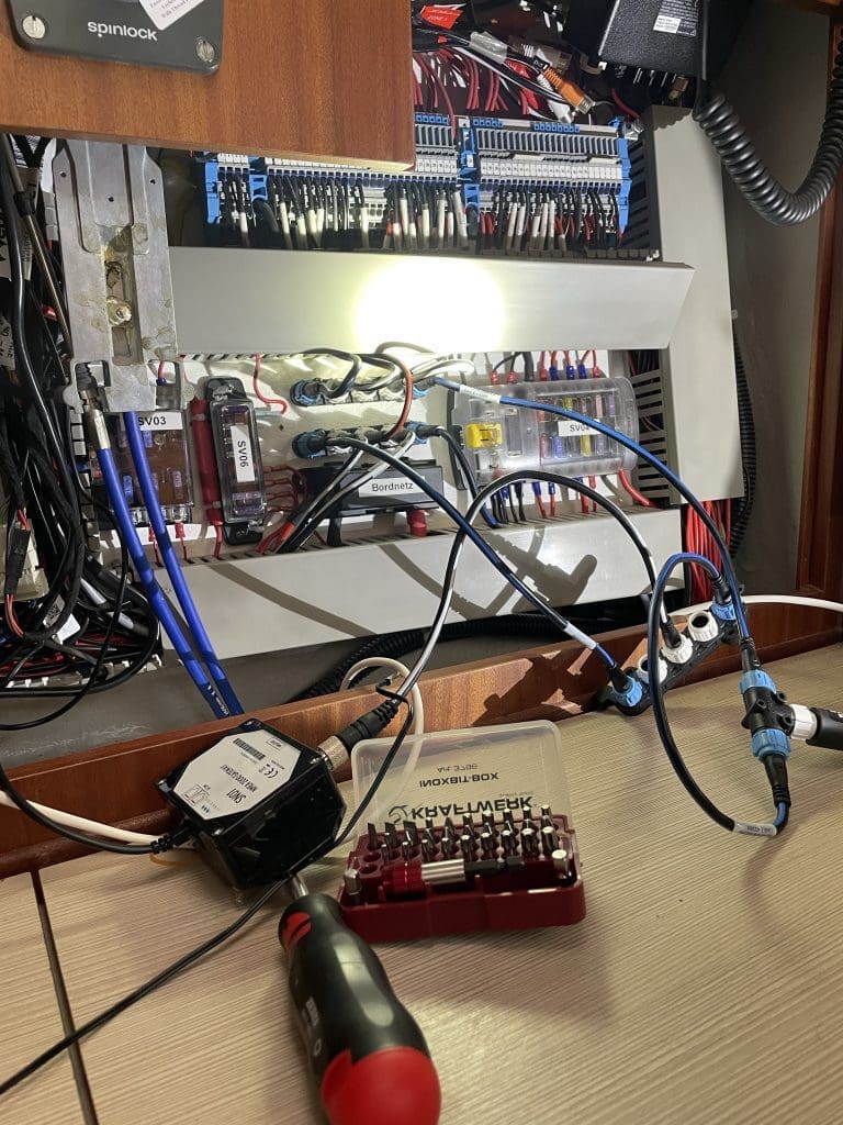 Im Reisegepäck habe ich viele Mitbringsel für den Clipper, auch viel Technisches, das ich in den letzten Wochen entdeckt und dann zum Einbau geplant hatte. In den meisten Fällen war Gilles von der Balena, einer ziemlich hoch gerüsteten Sirius 35, der Ideengeber. Dazu geht es an das Allerheiligste des Clipper, also den NMEA Backbone, das interne nautische Bordnetzwerk, über das alle navigatorischen Geräte wie die Plotter, Anzeigen, Tiefen- und Windgeber, der Autopilot, Kompass und GPS etc. miteinander kommunizieren.