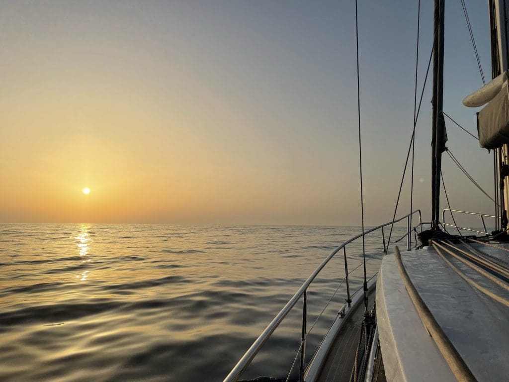 Die Wochenendsegler kommen gerade wieder von ihrer Tagestour in den Hafen zurück, als wir nach 8 Wochen Liegezeit die Leinen einholen und, wie die Sonne, hinter dem Horizont verschwinden. Der Wind kommt etwas stärker und in einem besseren Winkel, sodass es bis 4 Uhr morgens zu ganz anständigen Kursen und Geschwindigkeiten kommt. Dann sind wir im Windloch und die nächsten 5 Stunden muss der Motor mit langsamer Fahrt helfen, dort wieder hinaus und in das Windfeld zu finden.