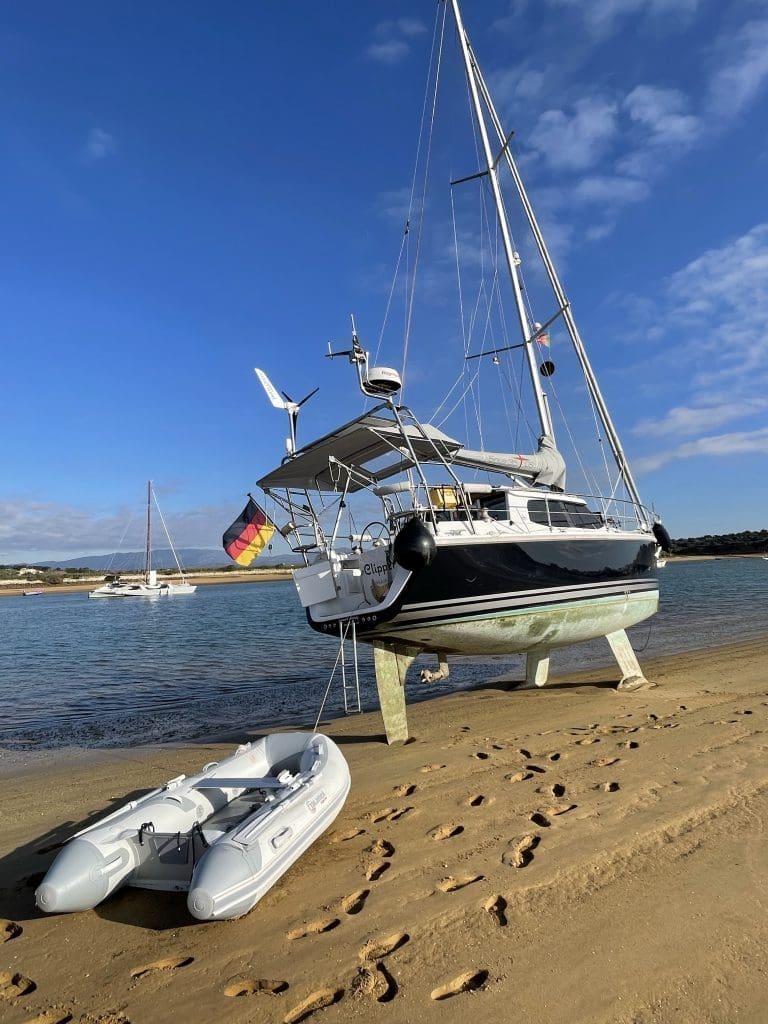 Alte Sünden beim Einparken sollten aus dem GelCode herausgearbeitet werden und ein Rückschlagventil der Toilette war zu tauschen. Ich fuhr aber nicht direkt nach Lagos, sondern machte einen kleinen Abstecher nach Alvor und legte mich wieder in der Lagune vor Anker, es ist einfach zu schön dort. Hier konnte ich auch trocken fallen und mein Unterwasserschiff und insbesondere die Opferanoden nach der langen Hafenliegezeit überprüfen.